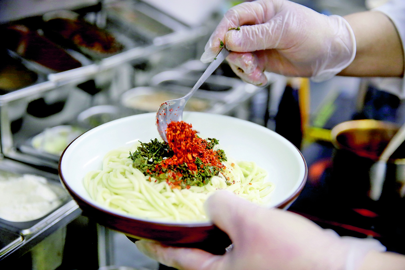 盛在碗里的面条,香味扑面而来。再浇上提前准备好的浇头,立刻让你食欲大开。为了满足不同顾客的需求,店里的浇头近10种。