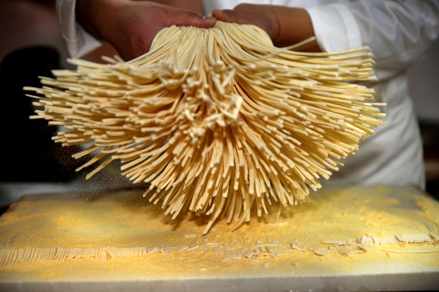 手握刀柄,一抬一压,粗细均匀的面条就有了。这还没有完,只见秦创年手捏些许面粉均匀撒在面条上,紧接着提起面条抖了抖。“一是让面条充分舒张,二是抖掉多余的面粉。”他说。