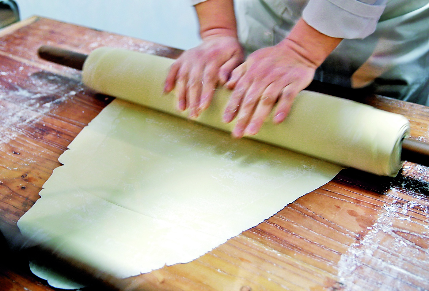 面压好后就是擀。当天,秦创年以4斤面粉打底,所以擀面时用到了长短不一的两根擀面杖。两根擀面杖交替着擀,也是不多见的。但见秦创年双手灵活轮换、操作快速熟练,不一会儿就把面团擀成一张薄薄的面皮。擀面过程中,秦创年不断测量着面皮的厚度,“咱这都是有标准的”。