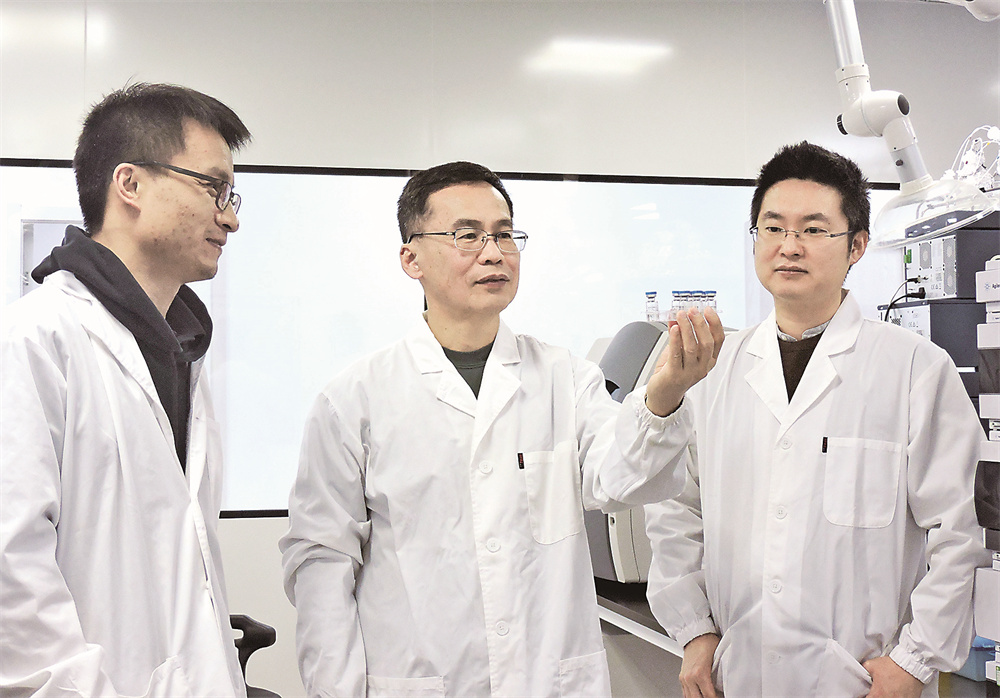亚宝药物研究院总经理卓朗博士(中)与大分子药学总监谭麟博士(右)、大分子药学首席研究员王星星(左)进行药品研发
