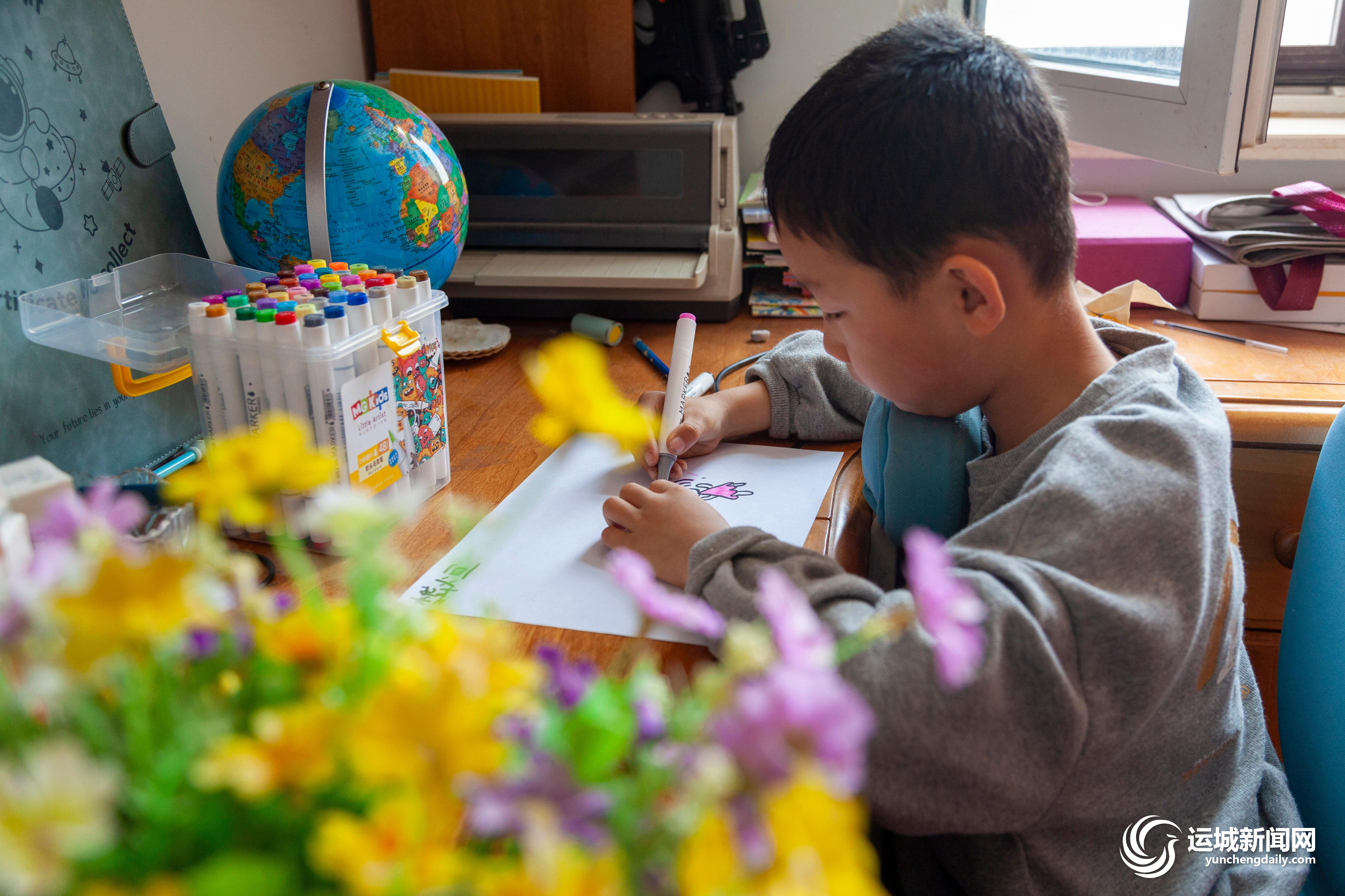 当天早上,李岱烜早早地趴在书桌上,用水彩笔描绘着妈妈的模样。“妈妈很漂亮,我要用鲜艳的颜色画妈妈。”他一边讲一边认真准备着母亲节礼物。