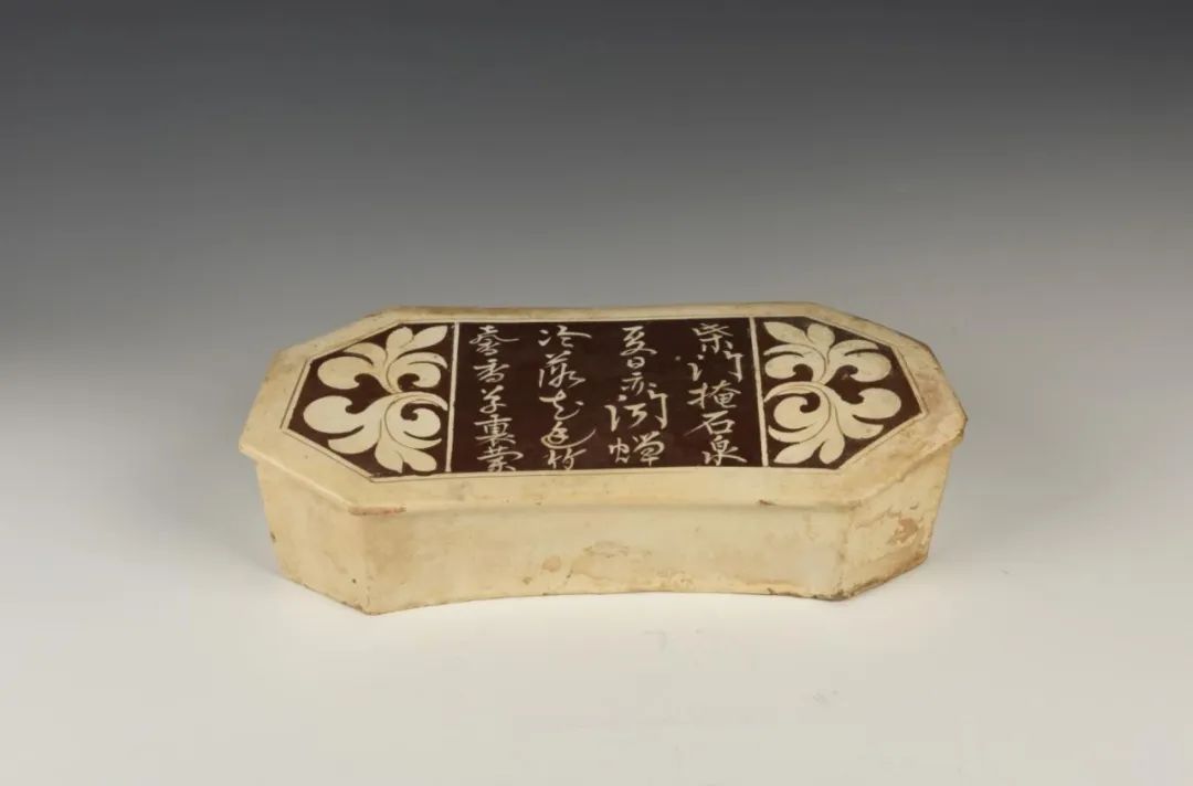 ▲白釉褐彩诗文八角形瓷枕,北宋·河津窑。长43厘米、宽20厘米、高11.2厘米。灰白胎,乳白釉,底面未施釉,有流釉痕。枕面出檐,前壁内凹,侧壁有气孔,平底。枕面依枕形剔框,框内中部竖书五言行草诗文“柴门掩石泉,夏日亦闻蝉。冷落花庭竹,馨香草里兰”,左右两栏剔卷叶纹。