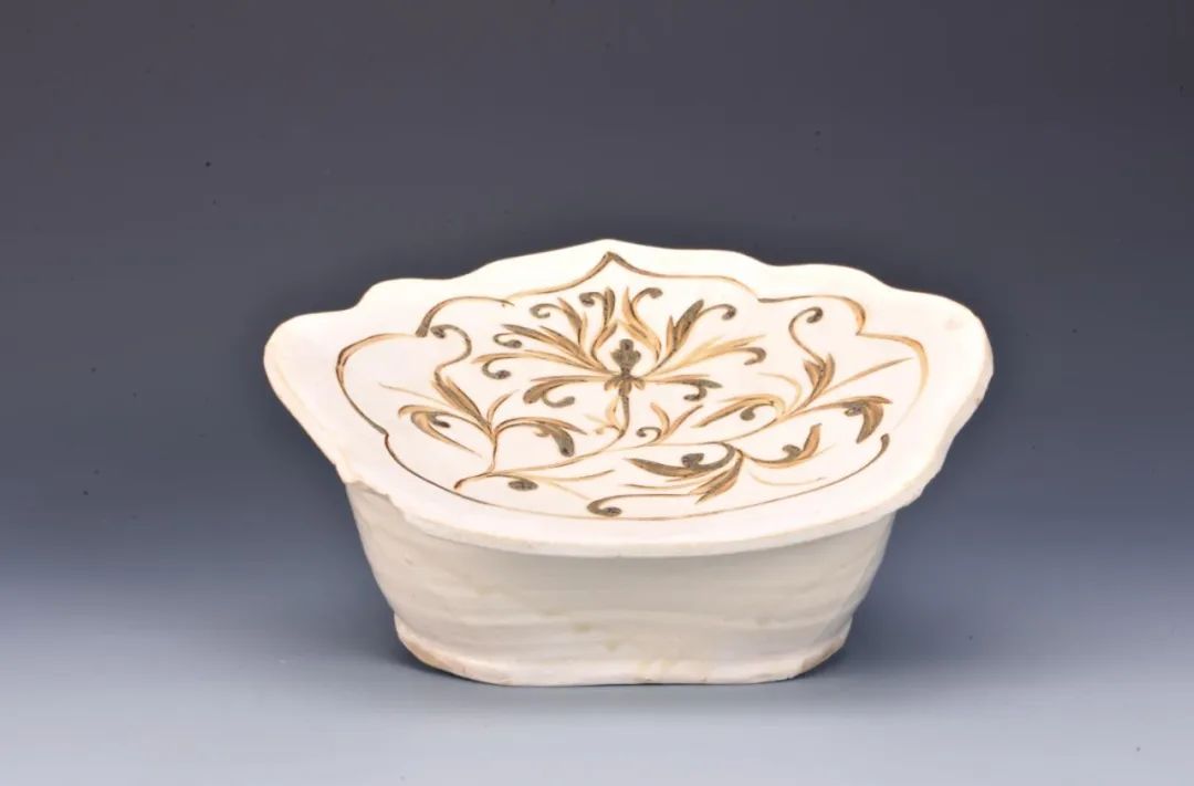 ▲白地褐彩菊花纹云头形枕,金·介休窑。米黄色半陶瓷胎,施半透明釉,白色化妆土盖到枕底部。枕面墨彩随形开光内绘折枝菊花纹,墨色微发褐,枕背面中央有一个通气孔。