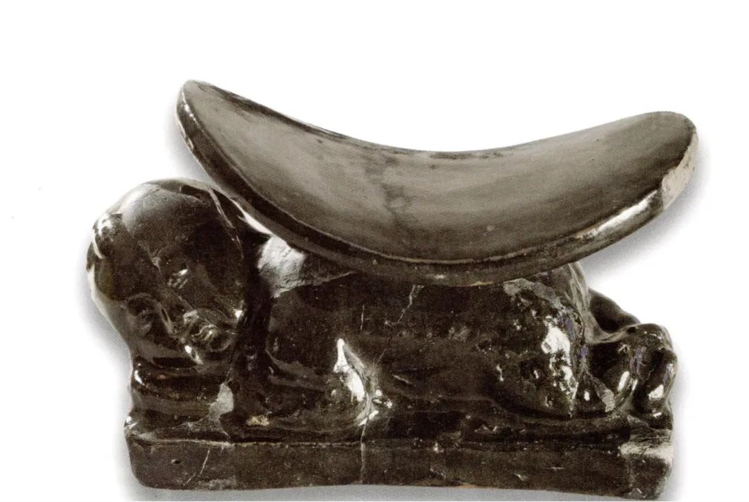 ▲俯卧孩儿枕,辽·浑源窑。1999年浑源青瓷窑发掘出土。椭圆形,枕面前高后低,中间下凹,两侧翘起。孩子俯卧,交脚,头部侧卧在扁枕上,身下有长方形底座。黄白胎略粗,黑釉泛茶末色。