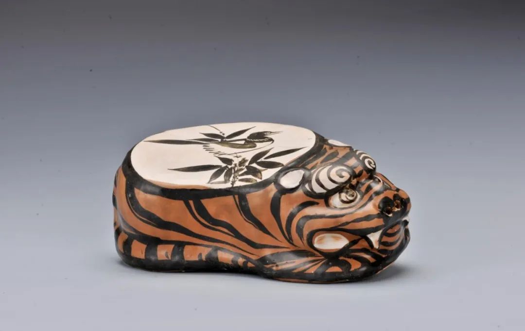 ▲白地黑褐彩新篁栖禽纹虎形枕,金·长治窑。褐灰白色半陶瓷胎,施透明釉,白色化妆土盖至枕底部。枕面为伏虎背面,白地褐彩绘新篁栖禽纹,枕侧面虎身绘褐地黑彩及白色化妆土虎皮纹,老虎鼻孔巧为通气孔。