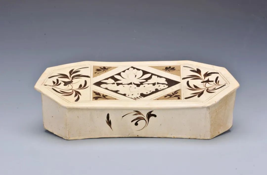 ▲白地剔地填黑刻荷花纹八角形枕。金·河津窑。长44.8厘米、宽18.9厘米、高10.8厘米。褐黄色半陶瓷粗砂质胎,施透明釉,白色化妆土盖至枕底部。枕面划褐彩八边形双线框,中间菱形开光内白地填黑剔荷花纹,四角三角形内露地饰褐彩花蝶纹,左右两栏绘褐彩折枝花卉纹。