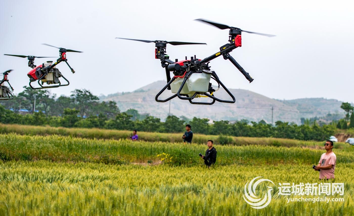 5月12日,几台极飞科技公司植保无人机在盐湖区上王乡垣峪村的麦田里实施“一喷三防”统防统治作业。