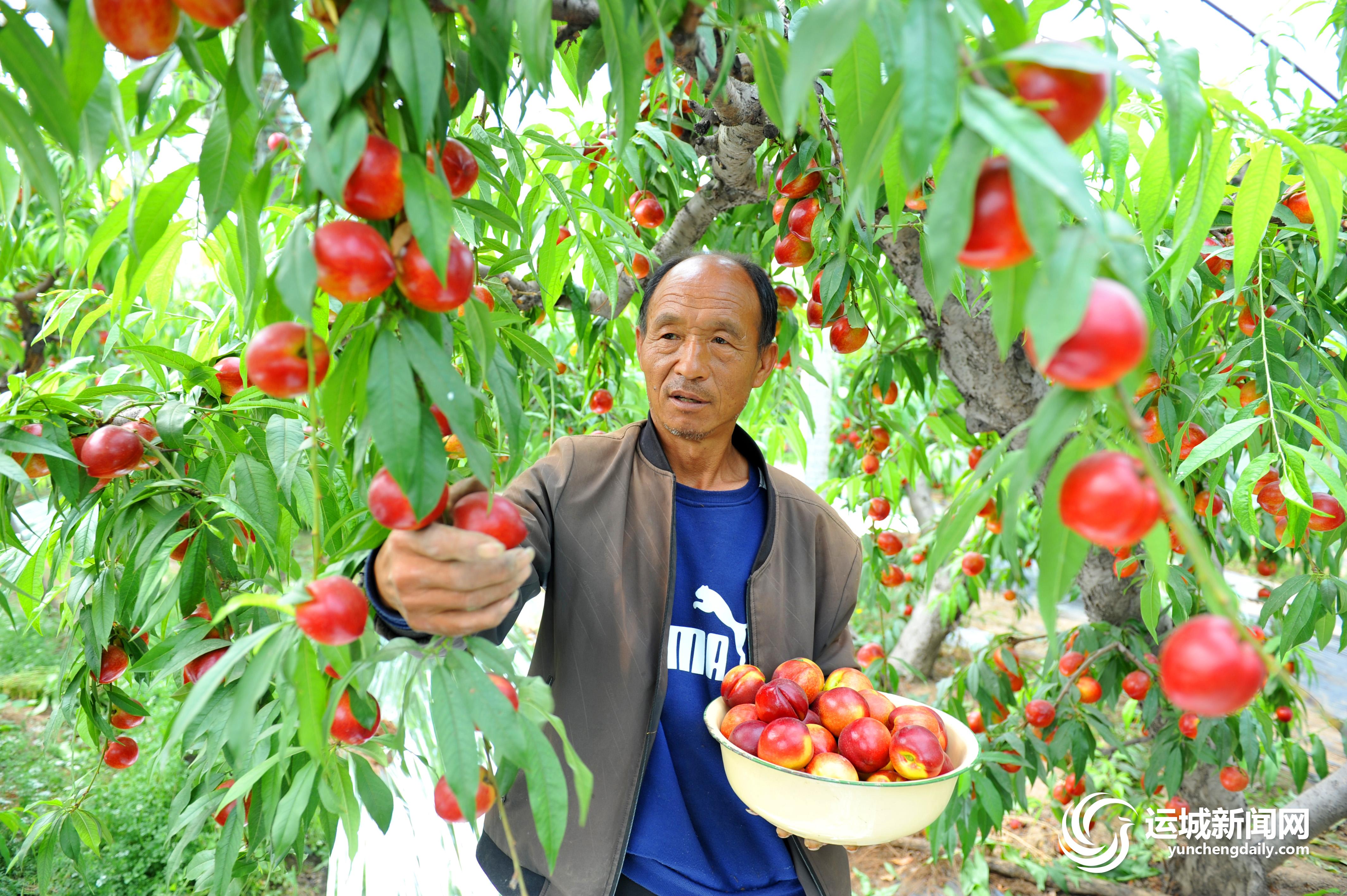 5月11日,稷山县清河镇荆庄村村民崔引明在大棚内采摘油桃。稷山县清河镇荆庄村引领农户发展日光温室大棚油桃种植,加强科学管理,使种植的油桃连年丰收,目前已发展温室大棚50多个,种植油桃面积达200余亩。