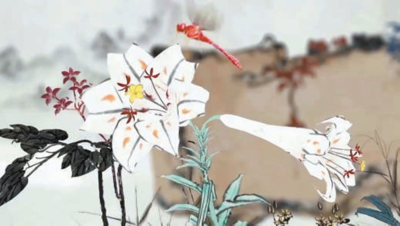 雁荡山上的野花恣肆绽放,藤蔓缠绕巨石,蜻蜓飞舞其间,纪录片第三集《记写雁荡山花》片头的动画是团队最早创作的一集样片,这段短短的动画前后制作了约一年,经历了反复的修改。李瑶说:“当时我们觉得潘天寿《记写雁荡山花》的画面元素多,让它动起来相对容易,就从它入手,结果发现太难了。水墨画讲究晕染,边界不明显,但3D建模需要明确的边界线,这就是二者矛盾的地方。”