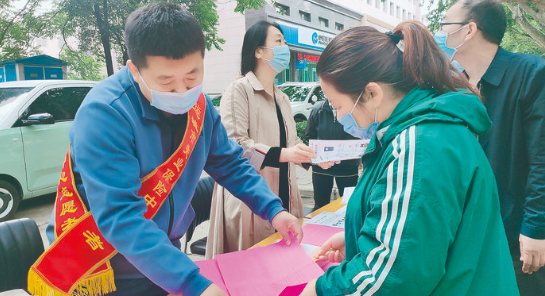 运城晚报讯(记者 陶登肖)“我以前交过3年养老保险,这两年没有交,能续交吗?有什么标准?”“可以。按省里公布的上年度全口径平均工资的60%~300%之间,您自主选择。”5月13日,在市社会保险中心门口,工作人员向市民宣讲新业态从业人员社会保险政策(上图)。