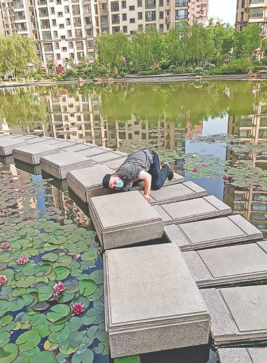 据张先生说,前两天他在小区散步时衣袋里的车钥匙不慎滑落、掉入湖中,当时他非常着急,就到门卫室寻求帮助。保安班长郭胜军听说后,立马随他来到事发地点。郭胜军查看了地形后,脱下外罩、挽起衣袖,双腿侧跪在湖中石板拼接的小径上,将手伸进石板缝隙间的湖水中来回摸索、寻找(下图),终于捞到了车钥匙。当张先生对郭胜军表示感谢时,郭胜军摆摆手说:“没有啥,咱小区保安和业主就是一家人,有啥需要帮忙的,你尽管说,别客气。”
