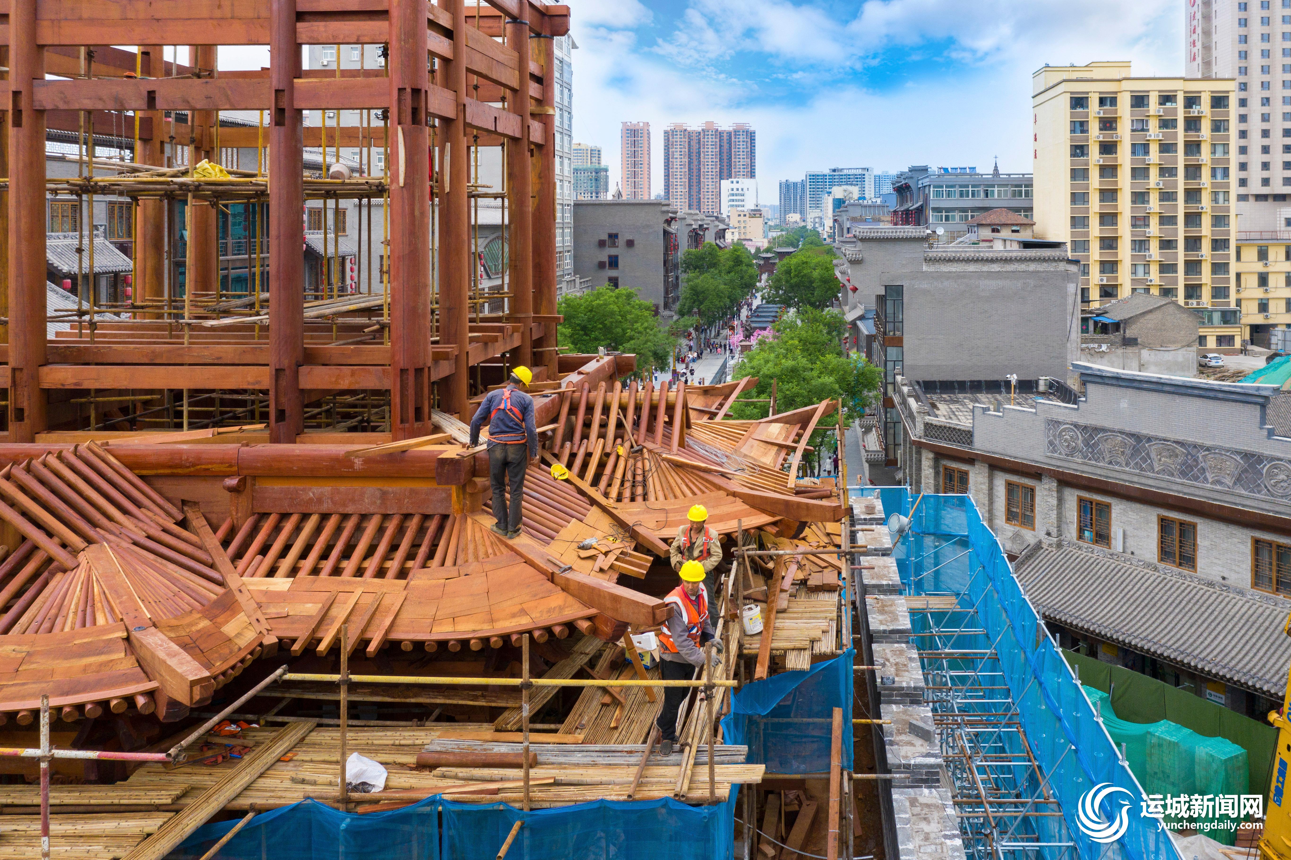 钟楼重建工程位于运城鼓楼西侧、盬街中段,是市委、市政府着眼高质量发展、提升城市品质的一项民生重点工程。日前,该工程在确保安全的前提下,合理推进施工进度。截至目前,底部楼台基本完工,总体工程也预计在7月全部完工。