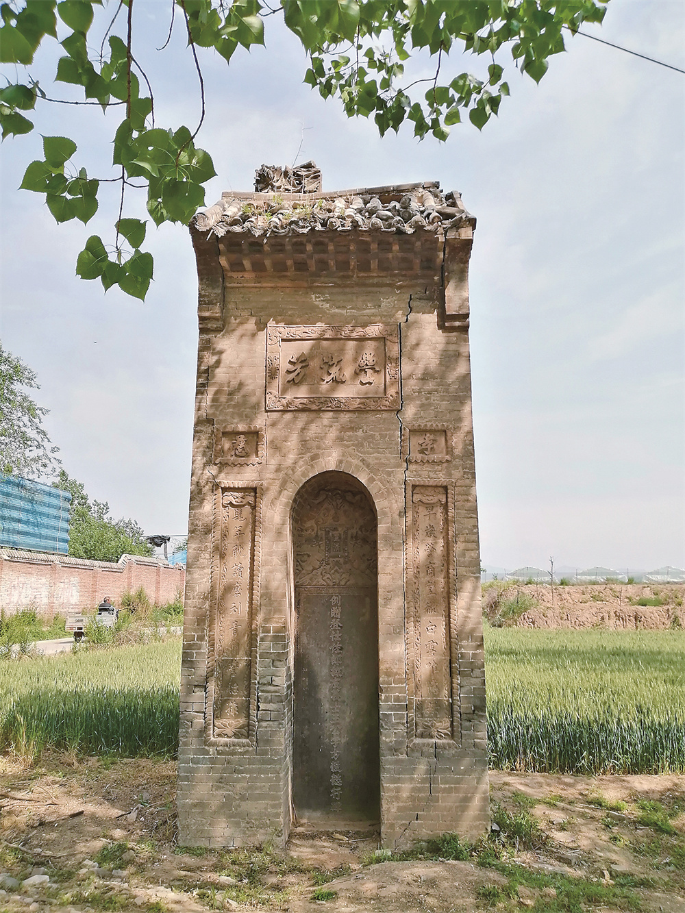 碑楼高3米多,坐东朝西,装饰有极具特色的砖雕。石碑所镌刻的行书古朴苍劲,非常珍贵。碑文主题记述王芳的生平事迹,个别文字已难辨认。碑额正中是“皇清”二字,是对大清的尊称。碑面正中有“例赠登仕佐郎故友义士王公字方毂懿行碑”大字,“登仕佐郎”是清代的文官官衔,从九品,不是实职,但也说明王芳的懿行得到了朝廷的认可。“例授”,指的是循例授官,即朝廷按照定例授予官爵。根据《清会典·吏部·验封清吏司》记述,清制封典,朝廷按照定例授予官爵:授给本身者为例授,因推恩而授给本人曾祖父母、祖父母、父母及妻之存者为例封,其殁者为例赠。