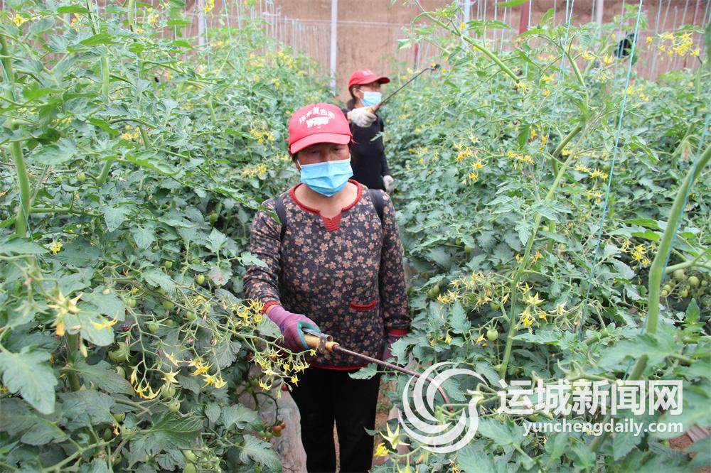 5月15日,闻喜县后宫乡阳庄有机蔬菜产业园里,村民为西红柿喷施叶面肥。