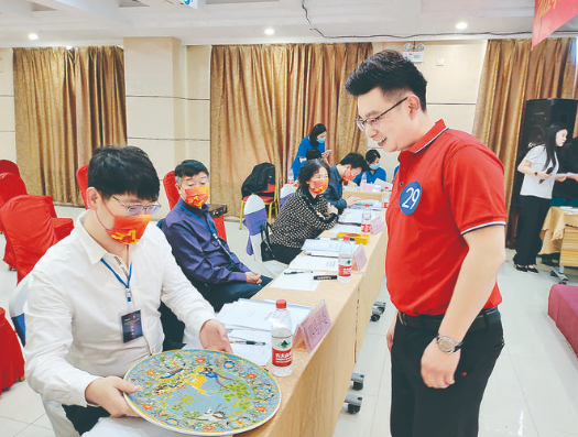 ▲参赛选手(右)向评委介绍参赛项目作品 记者 茹雅 摄