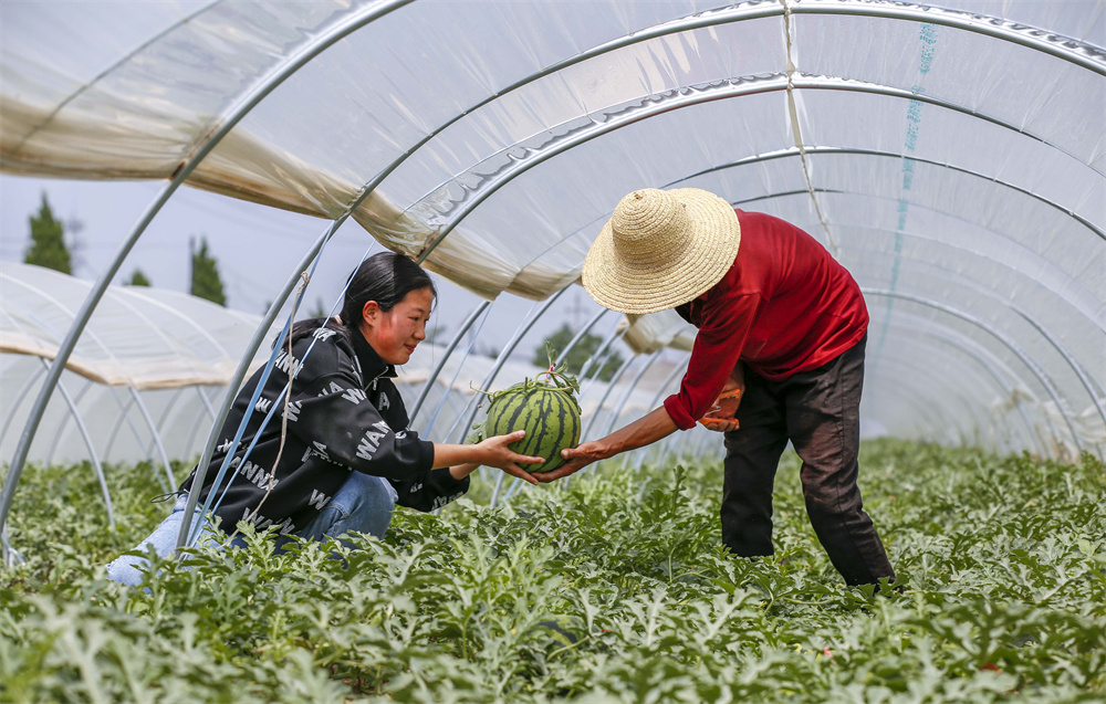 5月17日,永济市虞乡镇洗马村姑娘周瑞在帮家里收获西瓜。