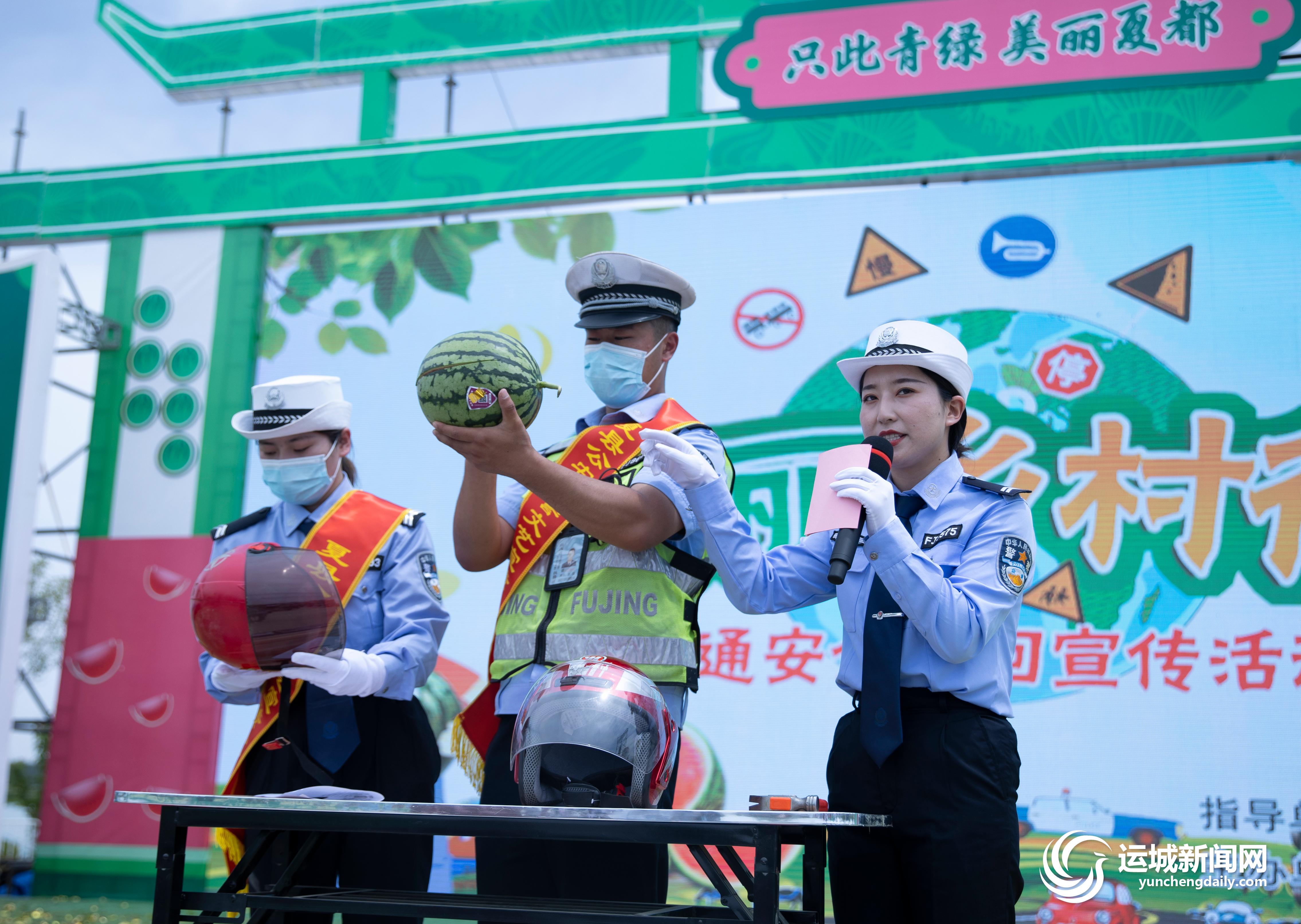 运城晚报讯(记者 樊朋展)5月18日,以“只此青绿、美丽夏都”为主题的特优产品推介会暨“夏乐”西瓜开园仪式在夏县禹王镇夏乐西瓜基地举行。活动期间,为切实加强农村地区交通安全宣传教育工作,市公安局交警支队联合夏县交警大队,借助西瓜开园仪式,举办了“美丽乡村行”交通安全文艺巡回宣传活动。