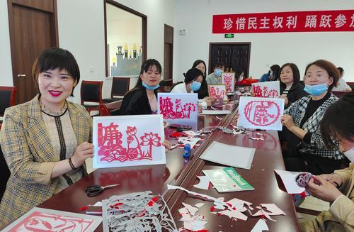 5月17日,芮城县妇联组织乡镇、社区妇联,以及部分县直单位妇委会妇女代表,在永乐社区家庭教育实践创新基地开展“涵养廉洁文化,建设清廉芮城”家庭助廉剪纸活动。图为妇女代表在展示剪纸作品。
