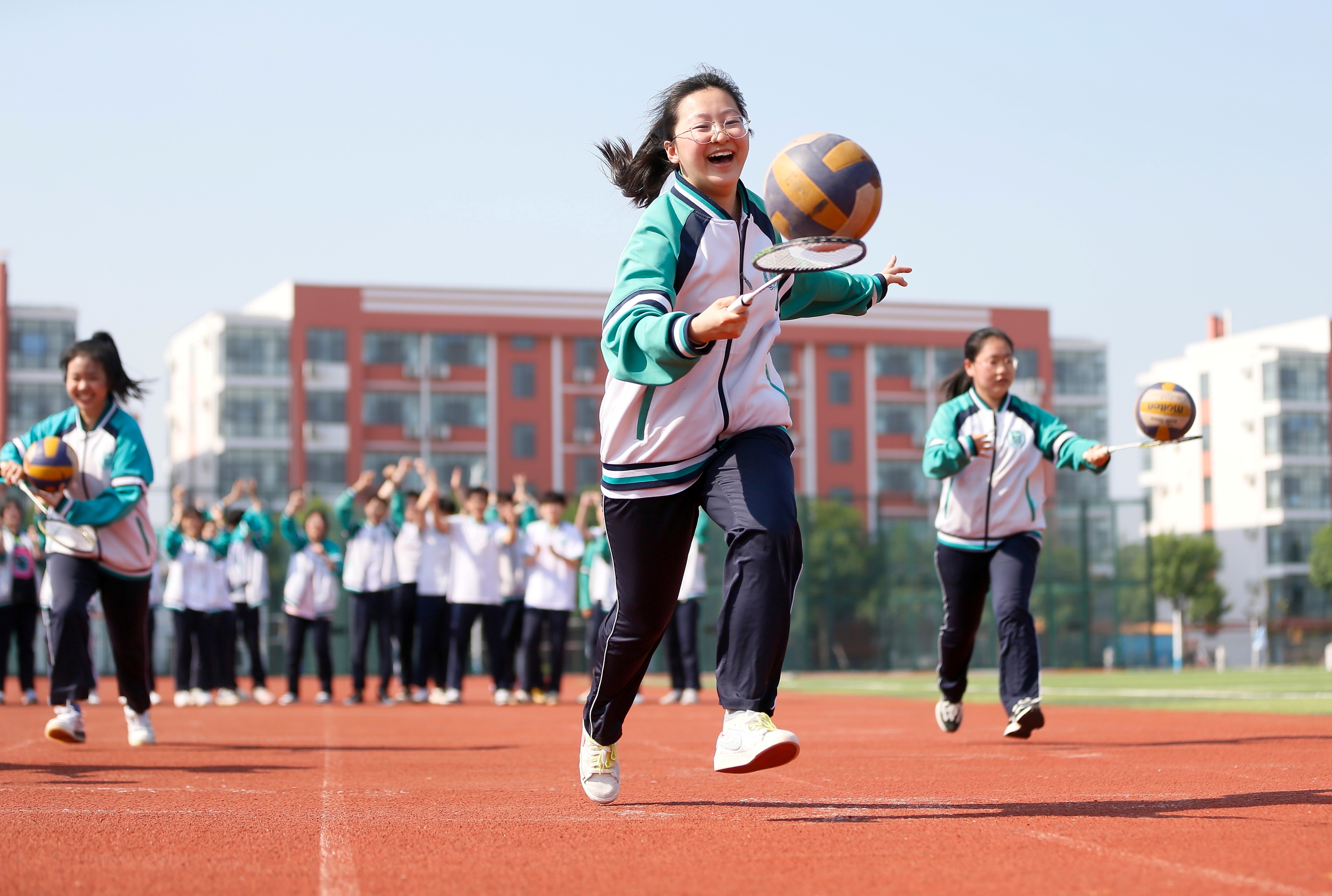 5月22日,青岛通济实验学校高三学生在进行“托起地球”比赛。