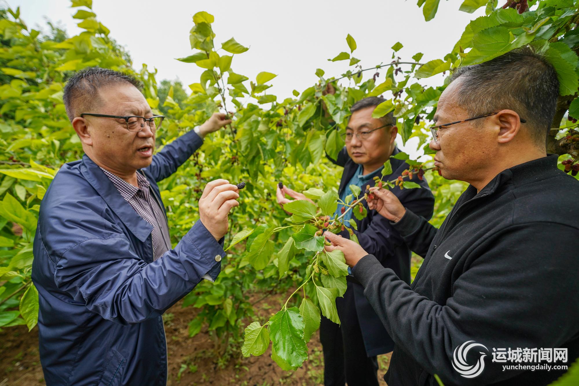 山西农大蚕科院技术团成员在芮城县陌南镇一桑园察看桑葚长势 记者 陈方斌 摄
