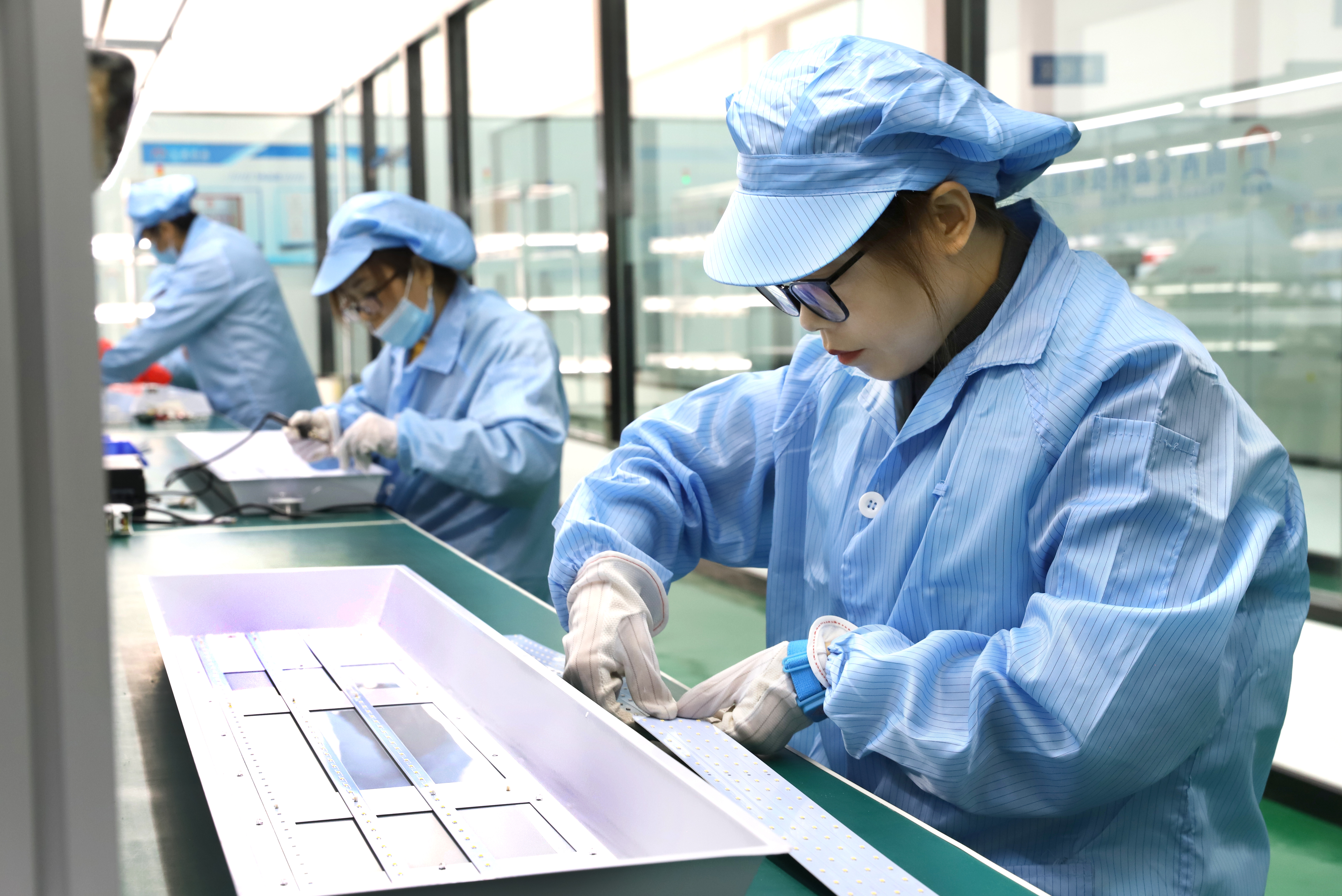 山西宝森科技有限公司工作人员正在车间组装LED灯具。该公司不断加大物联网系统技术开发自主研发和5G智能创新力度,提升产品科技的含量和附加值。