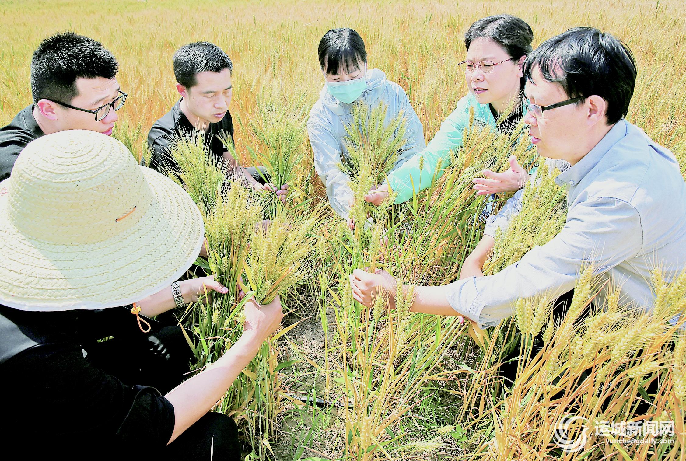 5月21日,位于风陵渡镇西阳村的芮城县十大产业集群(小麦)有机旱作生产基地,小麦专家在对“石农958”小麦品种的特征特性进行田间调研和测产。记者 卫行智 摄