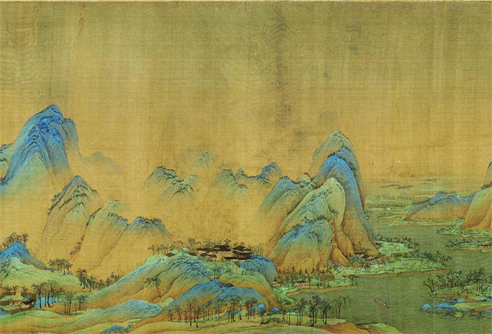 《千里江山图》纵51.5厘米,横1191.5厘米,绢本,青绿设色。采用远距离俯视,多点透视,全景式描绘了连绵群山、峰峦叠嶂、幽岩深谷、江湖浩渺、流溪飞泉、水村野市、渔船游艇、桥梁水车、茅蓬楼阁,以及捕鱼、游赏、行旅、呼渡等人物活动。描绘精细,意态生动;景物繁多,气象万千。该画卷全面继承了隋唐以来青绿山水的表现手法,突出石青石绿的厚重、苍翠效果,使画面爽朗富丽。构图于疏密之中讲求变化,气势连贯。中央美术学院专家研究认为,《千里江山图》绘制过程繁琐、细致,相当于画了五遍图:第一遍起稿以水墨描底,又称粉本;第二遍上赭石色,以展现冷暖对比,加强景物和谐;第三遍加入石绿,是由绿松石和孔雀石制成;第四遍再上一遍绿色进行叠加,以增强视觉感官上的立体感;第五遍才是上青色,取意“青出于蓝而胜于蓝”。《千里江山图》的长度是《清明上河图》的两倍多,耗费的精力和心血可想而知。