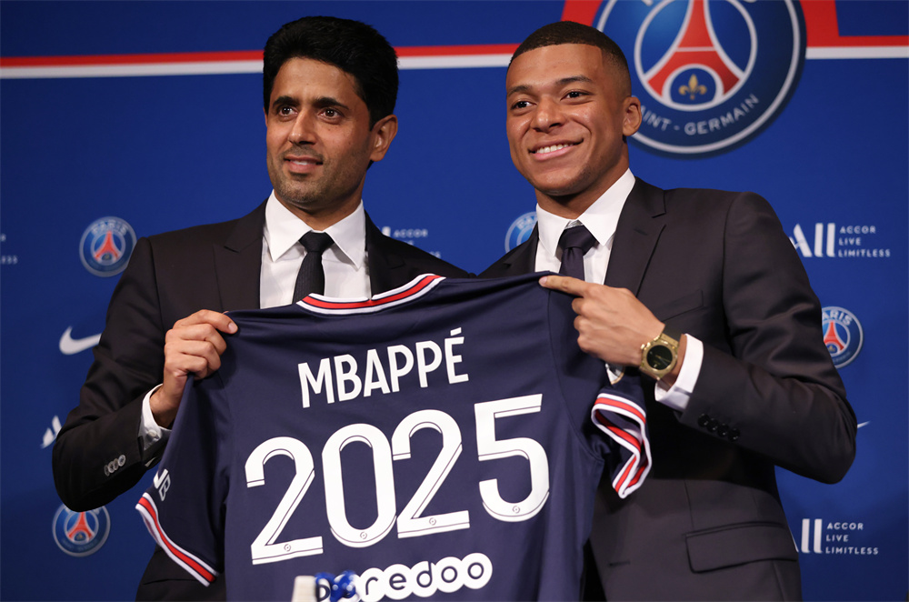 5月23日,在法国巴黎王子公园球场,姆巴佩(右)和巴黎圣日耳曼俱乐部主席纳赛尔在新闻发布会上展示印有“姆巴佩2025”字样的球衣。法甲巴黎圣日耳曼俱乐部21日官方宣布与23岁的法国国脚姆巴佩续约至2025年。