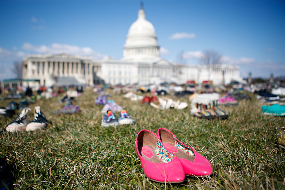 2018年3月13日,7000双代表自2012年美国康涅狄格州桑迪胡克小学枪击案以来枪击事件中遇难儿童的鞋子摆放在华盛顿国会山前的草坪上。人们以这种无声的方式,抗议国会面对枪击频发现状的不作为,呼吁枪支改革以保障儿童安全。
