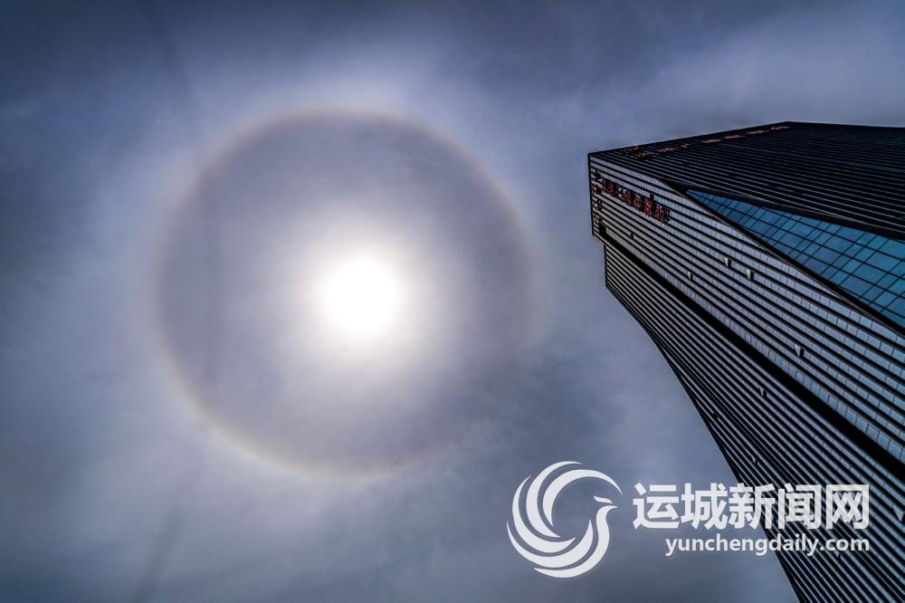 5月27日,在市区拍摄的日晕景象。当日,我市上空出现日晕景象,且持续时间较长,不少市民观赏到了这一自然景观。 日晕也叫圆虹,一种大气光学现象,是日光通过卷层云时,受到冰晶的折射或反射而形成的。当光线射入卷层云中的冰晶后,经过两次折射,分散成不同方向的各色光。 记者 薛俊 摄