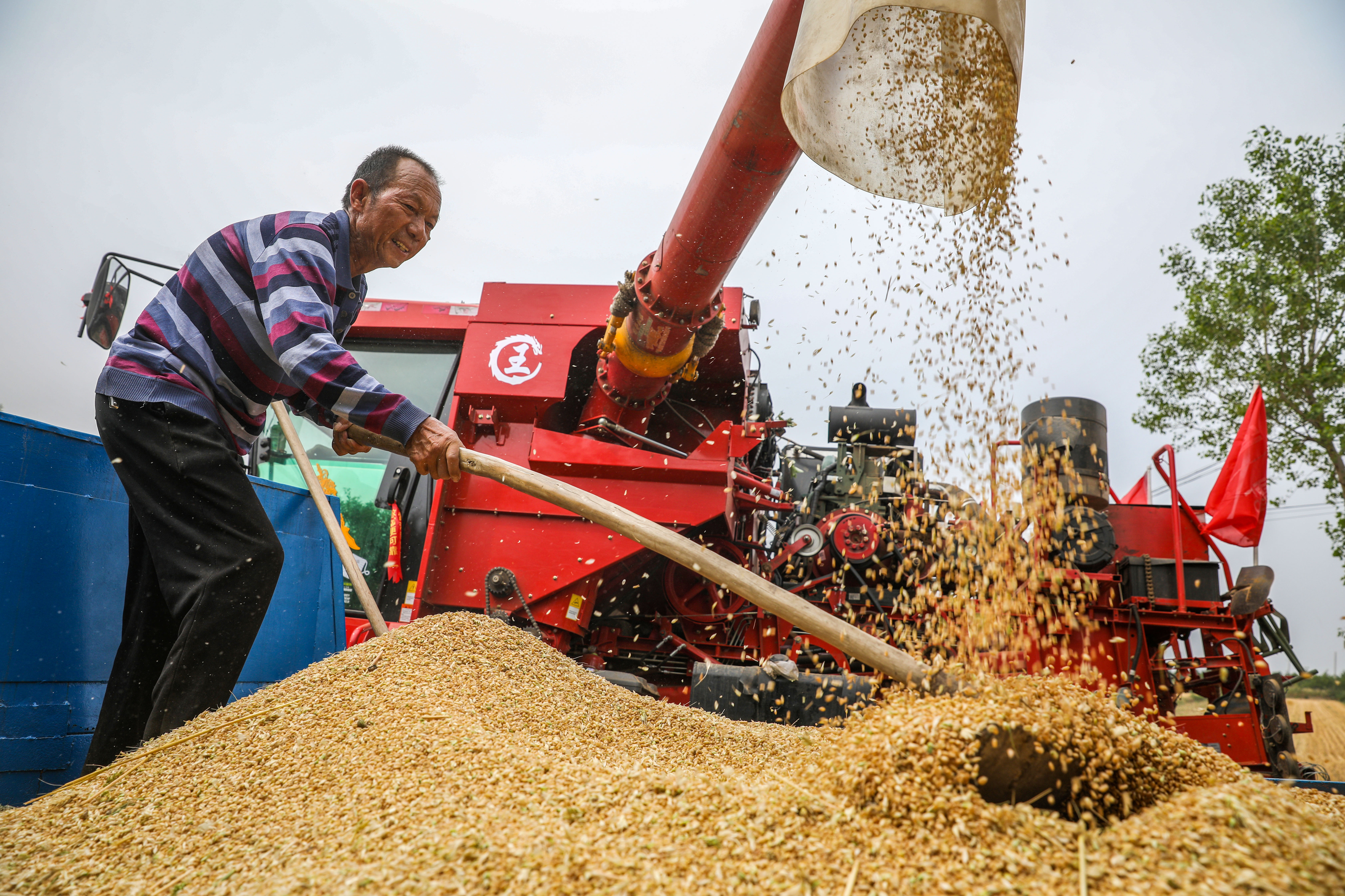 麦浪滚滚,机声隆隆,曲村田间地头一派繁忙的劳作景象。一台台大型收割机在麦田驰骋穿梭,一颗颗金色麦粒从收割机仓门倾泻而下、落地成“山”,秸秆打捆机、玉米播种机紧随其后有序作业。储祥好一边察看农机作业,一边与专业技术人员、农户交谈,详细了解小麦生产收获、玉米大豆复合播种、农机农资等情况。他叮嘱相关部门抓紧抓好“三夏”生产和农业防灾减灾等工作,加强组织调度和装备、油料保障等,确保机收作业人员和机械通行无阻、农资运输配送高效有序,全力实现夏粮丰收到手,农民增产增收。