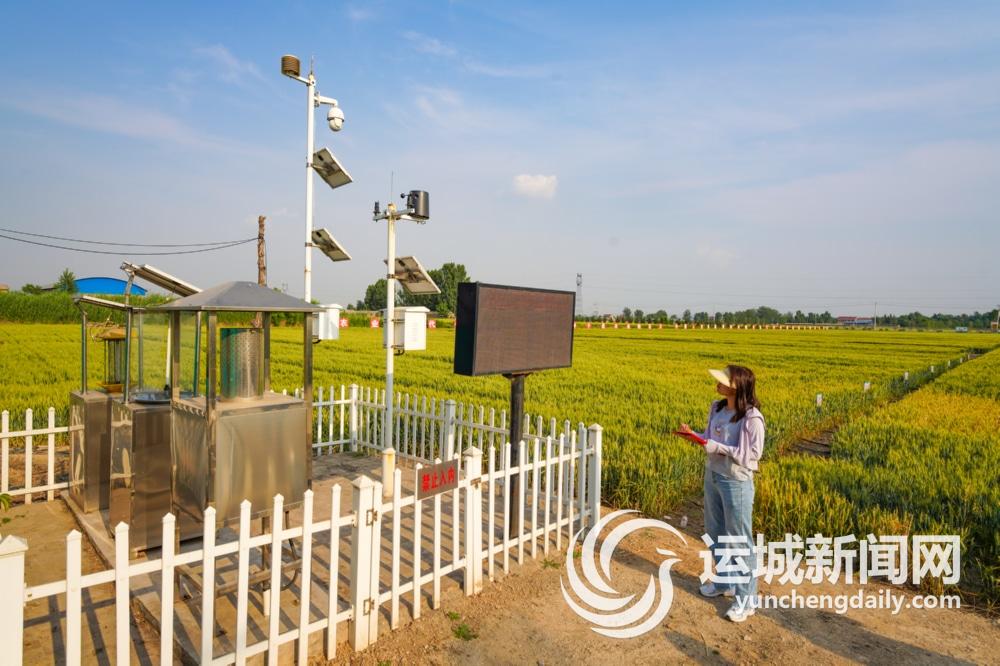 在高空昆虫控诱设备不远处,有一个无线农业气象综合监测设备。晁贞良介绍道,上面一个小碗形状的设备能测出雨量,3个黑色圆珠能测出风力,那个转板用来测风向。“这个设备更便于我们根据天气状况进行田间管理。”他说。
