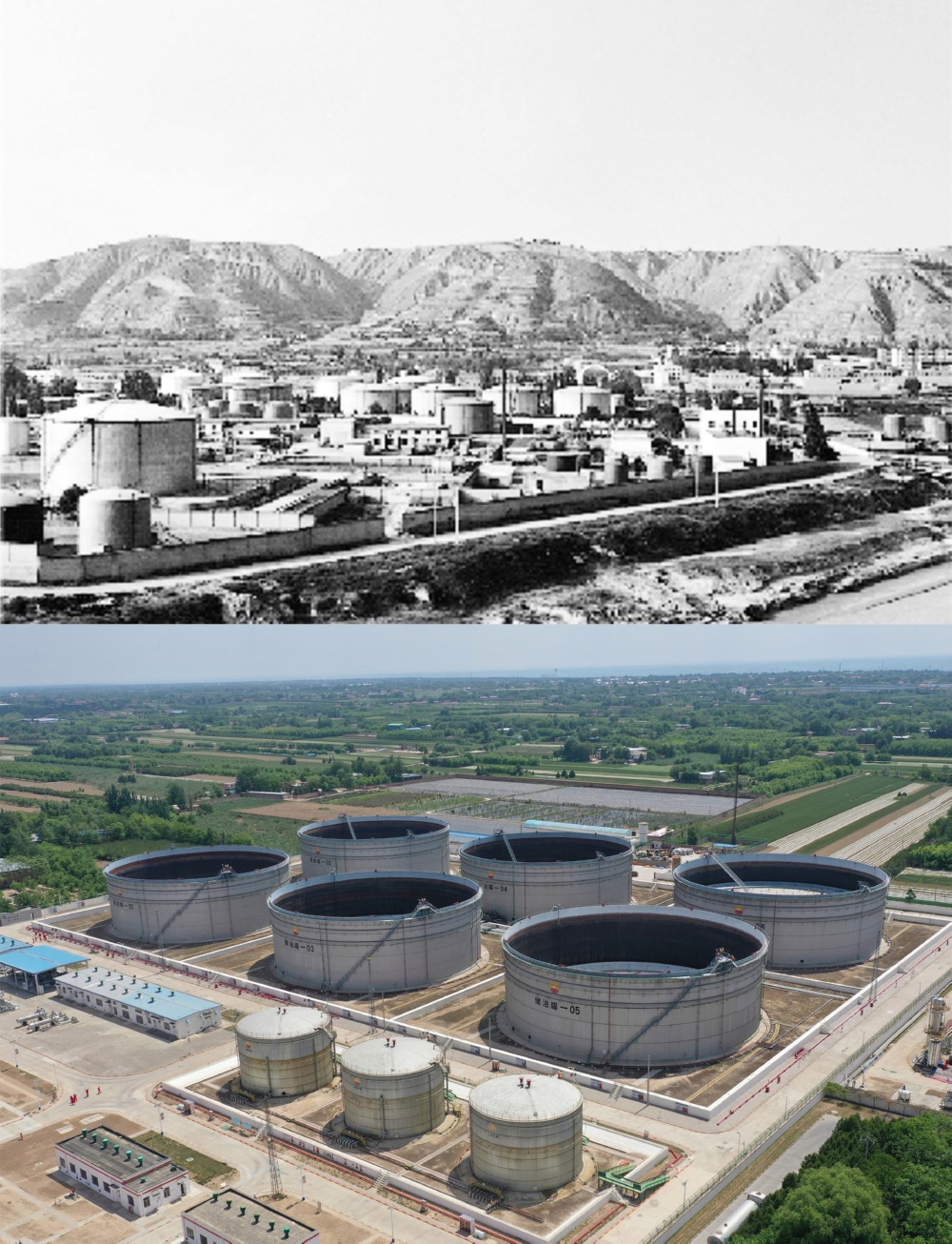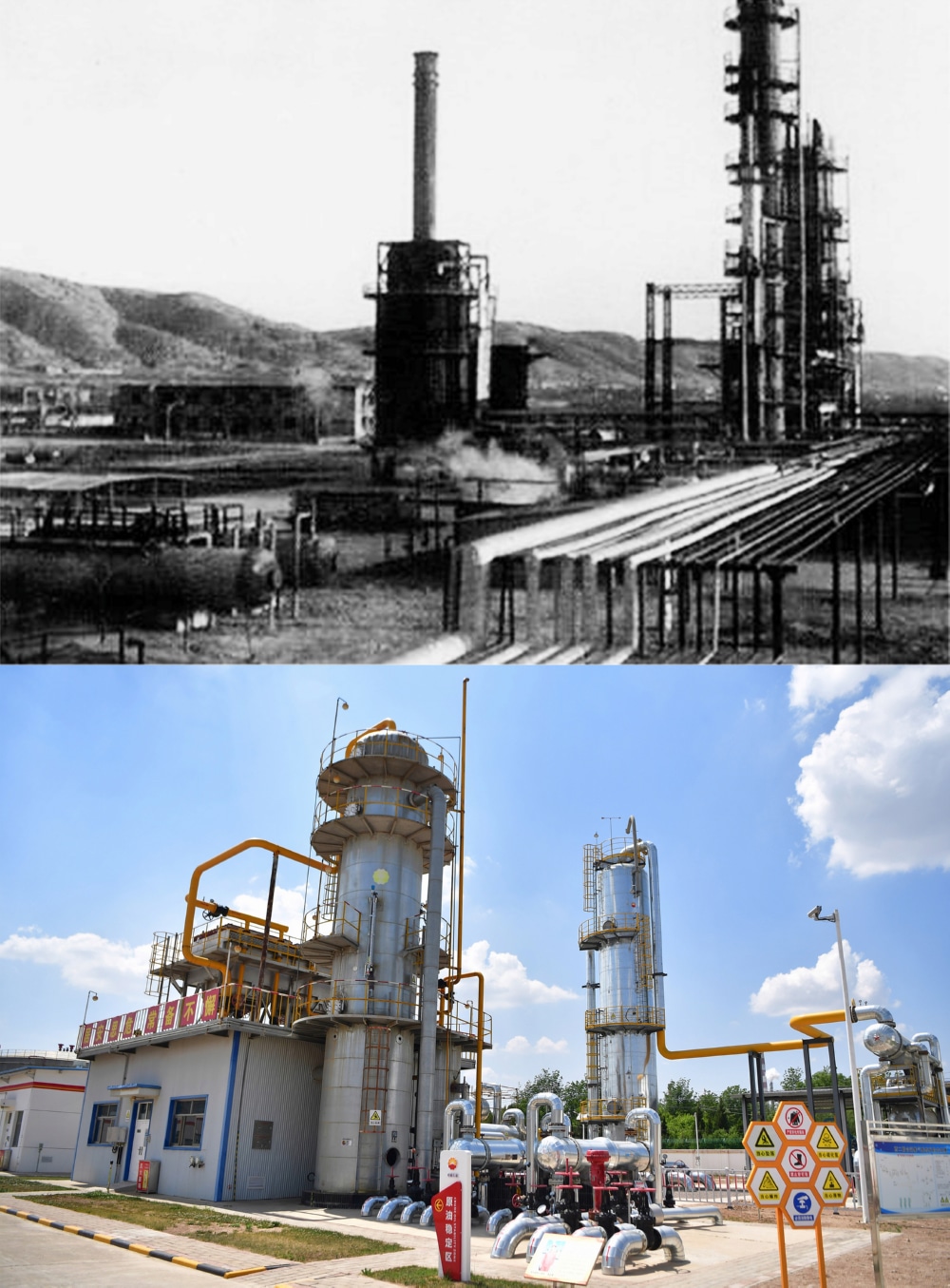 上拼版照片:上图为1978年长庆油田马岭炼油厂的生产装置(资料图片);下图为2022年5月24日拍摄的长庆油田采油二厂新一代的原油稳定装置(新华社记者 陈 斌 摄)。