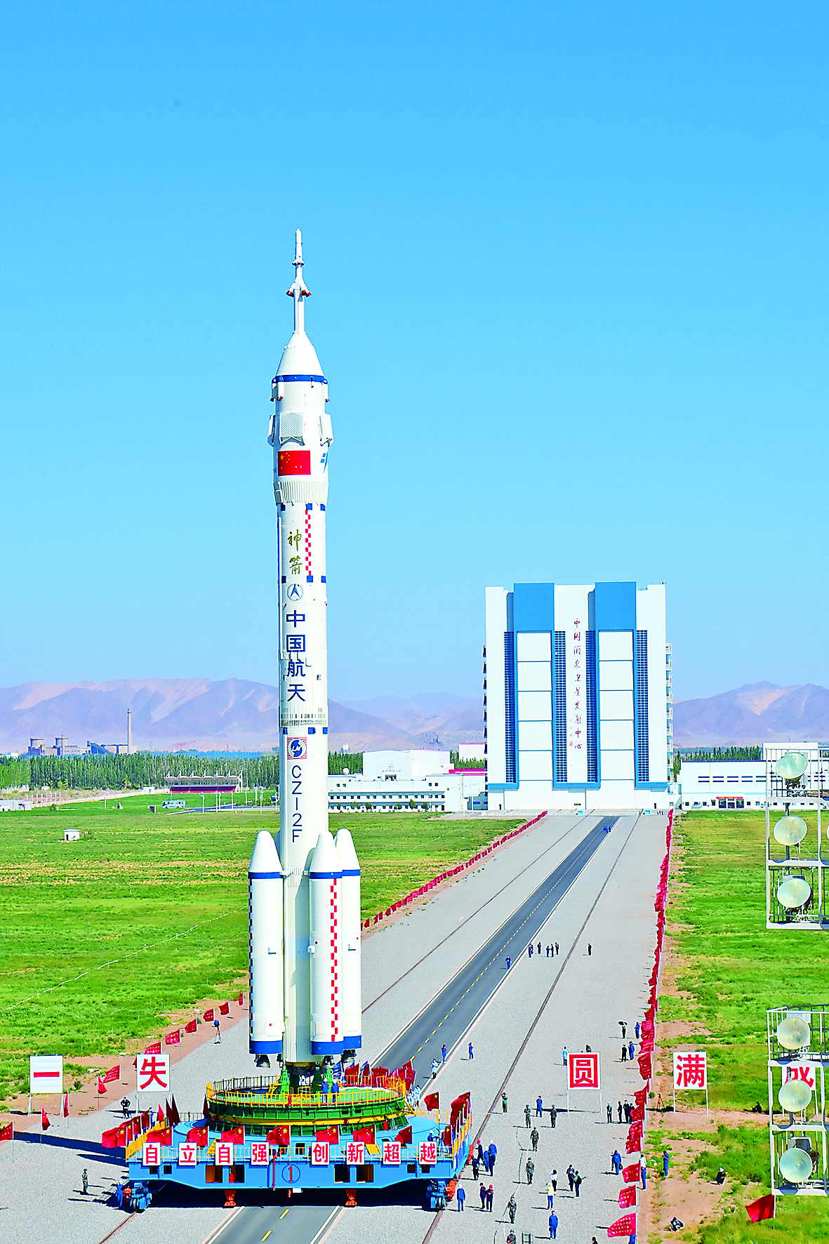 5月29日,神舟十四号载人飞船与长征二号F遥十四运载火箭组合体正在转往发射区途中。 当日,神舟十四号载人飞船与长征二号F遥十四运载火箭组合体已转运至发射区。 目前,发射场设施设备状态良好,后续将按计划开展发射前的各项功能检查、联合测试等工作。