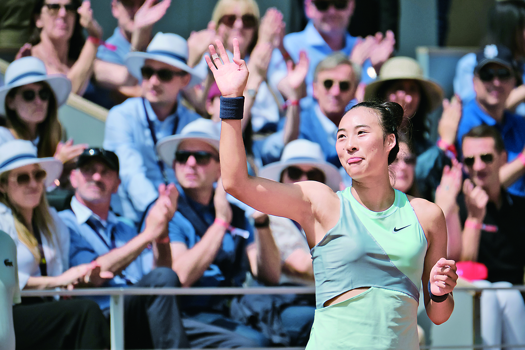 5月28日,中国选手郑钦文在比赛后向观众挥手致意。 当日,在法国巴黎举行的2022法国网球公开赛女子单打第三轮比赛中,法国选手科内中途因伤退赛,中国选手郑钦文晋级16强。