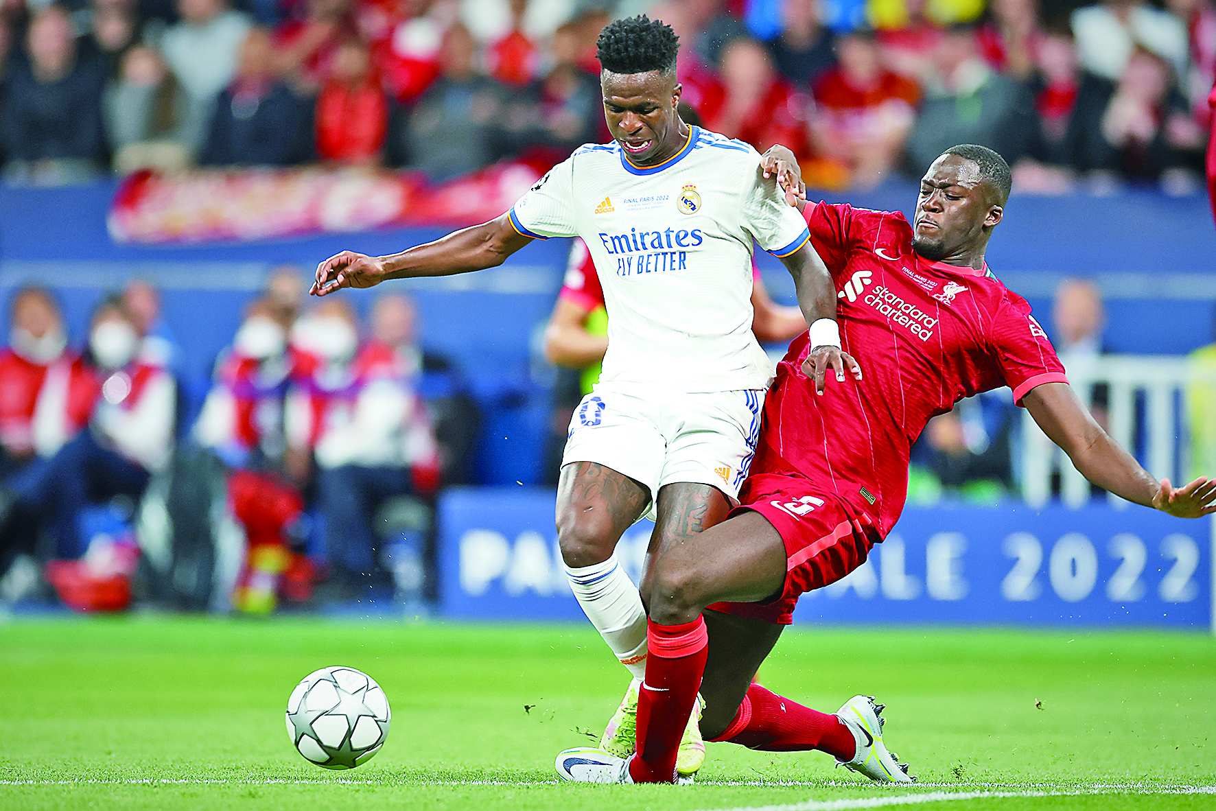▲5月28日,皇家马德里队球员维尼修斯(左)与利物浦队球员科纳特在比赛中拼抢。 当日,在法国巴黎举行的2021~2022赛季欧洲足球冠军联赛决赛中,西甲皇家马德里队以1比0战胜英超利物浦队,获得了队史第14座欧冠冠军奖杯。