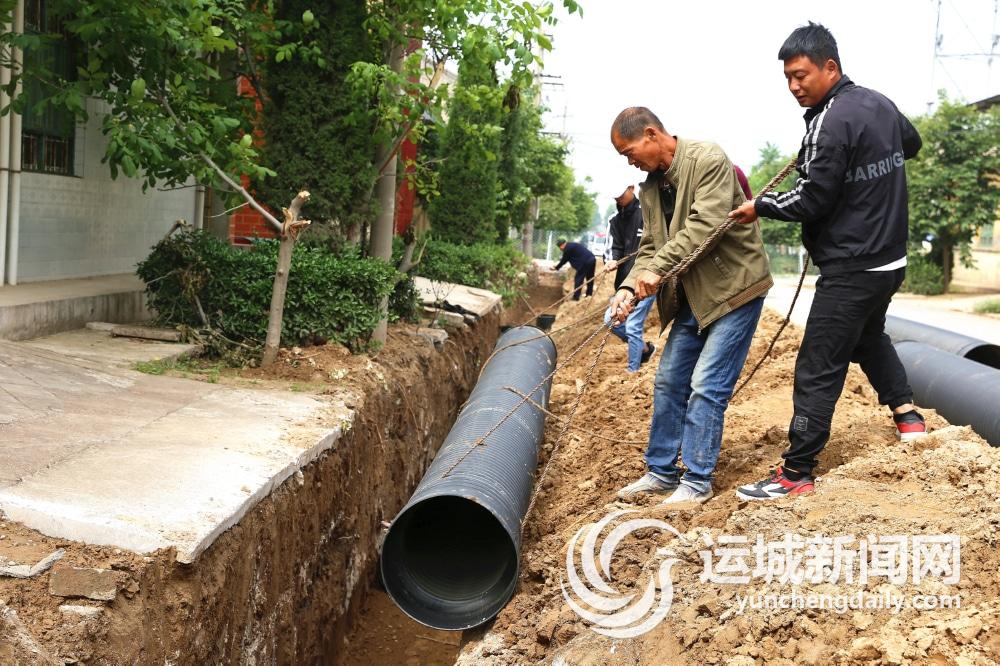 5月29日,施工人员在夏县水头镇水头村铺设雨污分流地下管道。