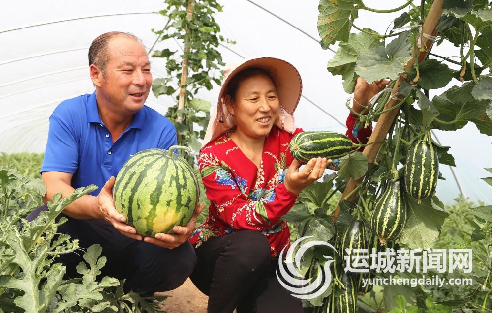图为5月27日,在盐湖区北相镇东古村“夏乐”西瓜生产基地“共产党员示范棚”,张杨明夫妇在给客商挑摘瓜产品。