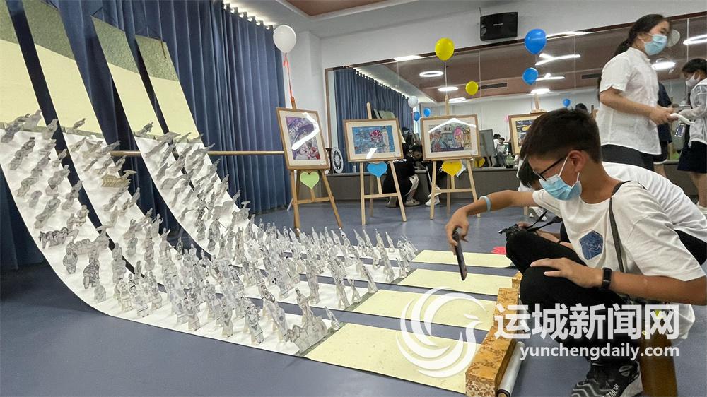 布艺、彩绘、动漫文创、航模制作等校园社团分区域展示了学生们的精美作品,并派出“小小讲解员”为参观的家长和学生进行社团简介和作品讲解。“这幅作品是我们斑斓画社的李欣怡同学创作的,它的主题是《爱眼护眼》,画面上的胡萝卜、蓝莓等都是对健康有益的,提醒我们要正确用眼,科学饮食,保护好自己‘心灵的窗户’。”昝昊希作为斑斓画社的讲解员,用自己独特的讲解方式让参观者感受到了斑斓画社全体师生的创作激情。