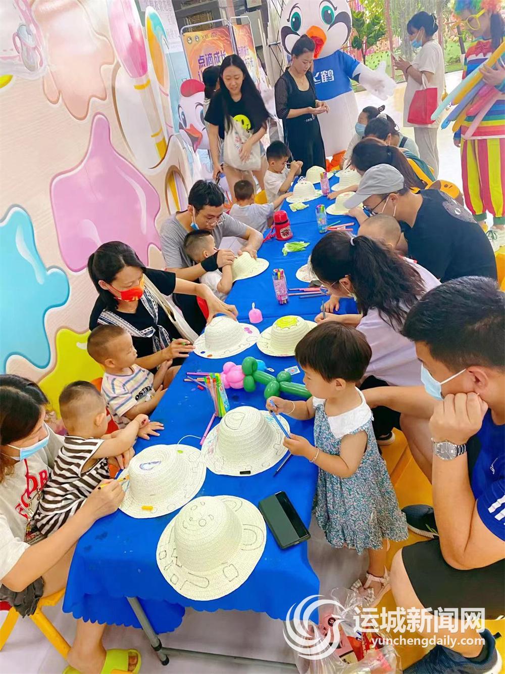 穿过潮能动物园,还有商户协办的儿童成长能量区。小朋友在这里可以免费参与投篮、草帽彩绘等活动。现场还有“小丑”“唐老鸭”等卡通人物与小朋友互动,发放气球等。小朋友们在这里可以体验仪式感满满的“六一”。
