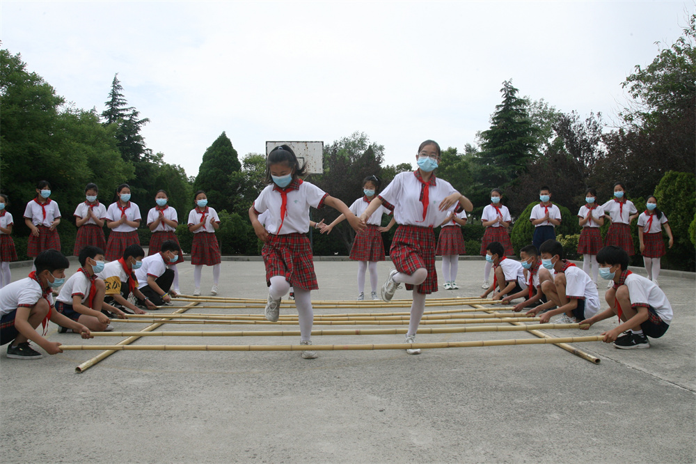 5月31日9时,悠扬婉转的民族乐曲回荡在盐湖区解州镇曲村小学的操场上,袅袅之音中,不时传来竹竿清脆的敲打声。“嗒嗒,嗒嗒嗒……”,走进一看,在竹竿时开时合的瞬间,一群学生敏捷地进退跳跃,顺利穿越竹竿阵,踏着音符、和着节拍,欢快地跳着竹竿舞(上图)。