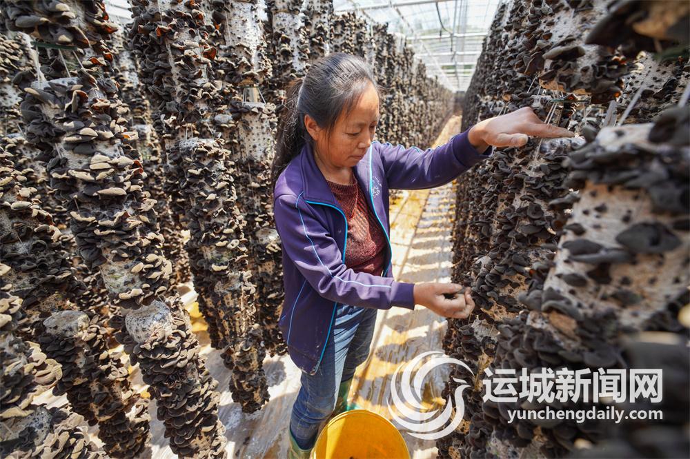 垣曲县英言镇关庙村木耳种植大棚内工作人员在采摘木耳