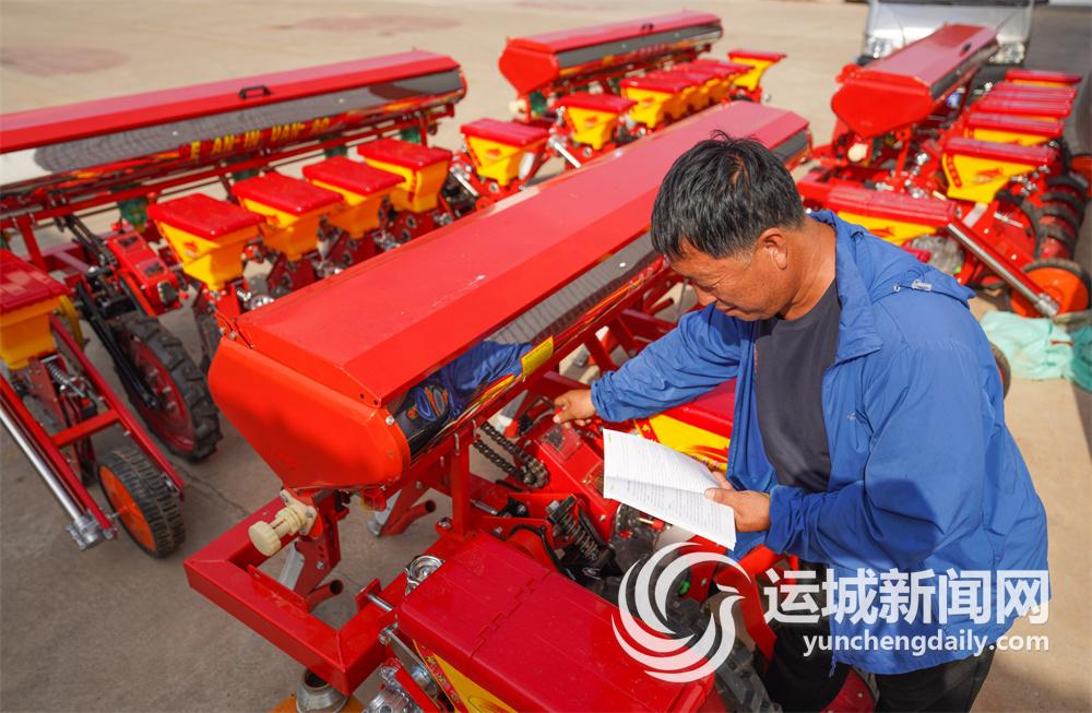垣曲县华峰乡河堤村远航农业机械专业合作社李红宁在检查新购的玉米大豆复播机