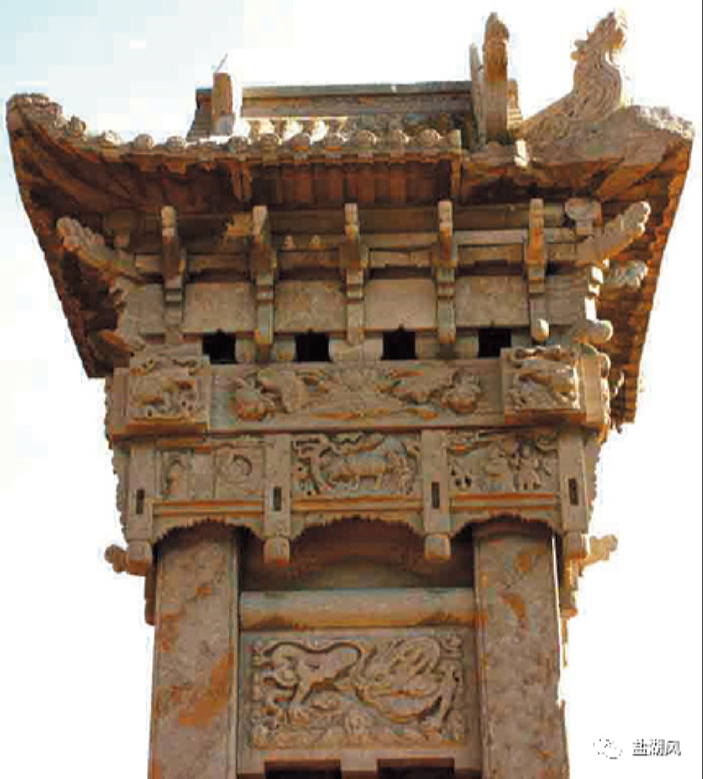 原来的碑楼顶部四个角还挂有铃铛,只要有风就会有铃声,所以当地人也叫它“铃铃花碑楼”。碑楼的四周,原来还有大概6米见方石围栏,每边有4个石柱,每个石柱顶端都刻有精美的狮子。
