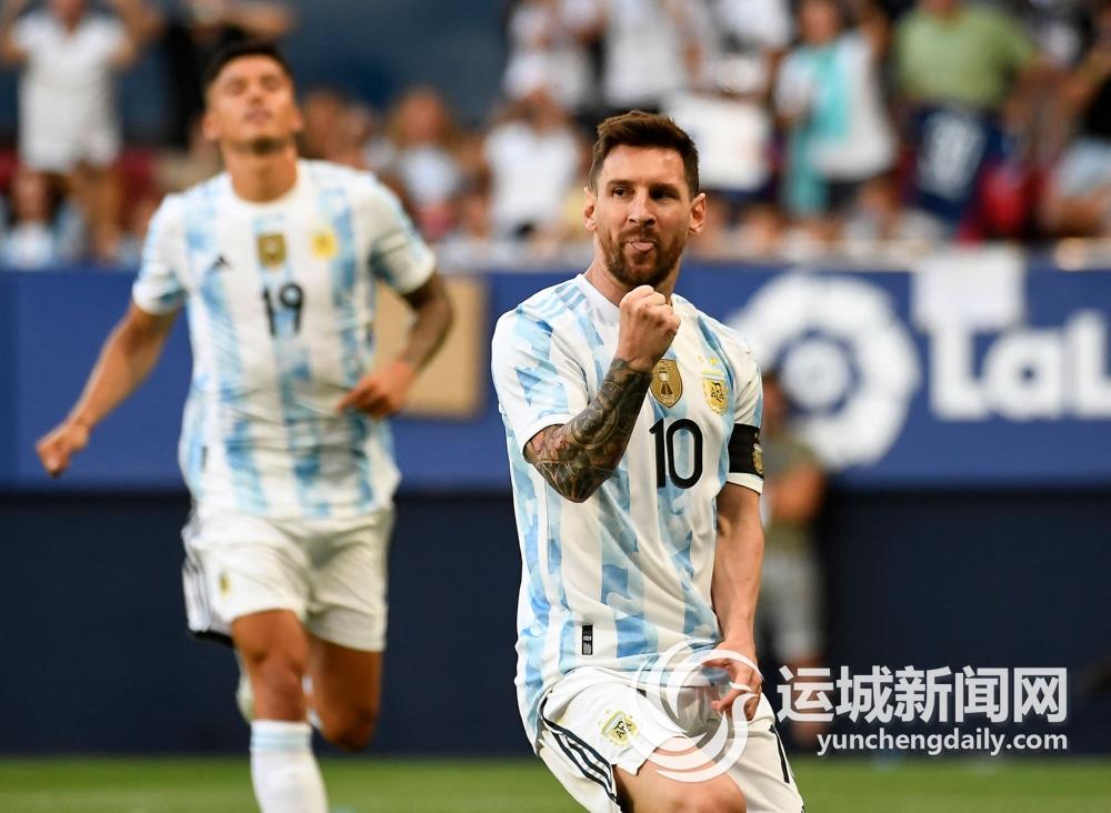 6月5日,阿根廷队球员梅西庆祝第一粒进球。 当日,在西班牙潘普洛纳进行的一场国际足球友谊赛中,阿根廷队以5比0战胜爱沙尼亚队,梅西包揽全部5个进球。