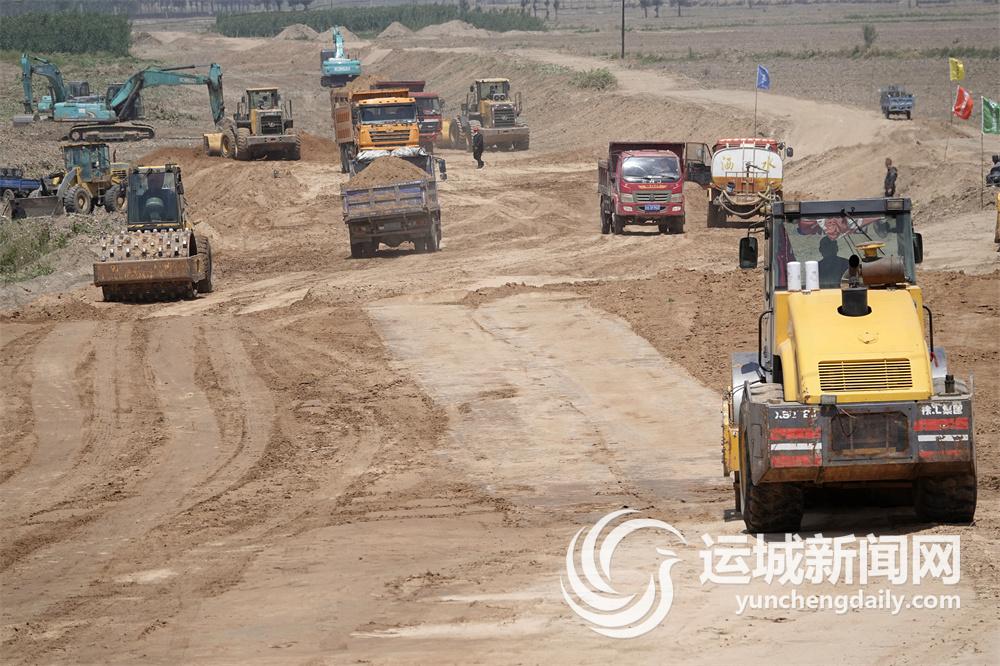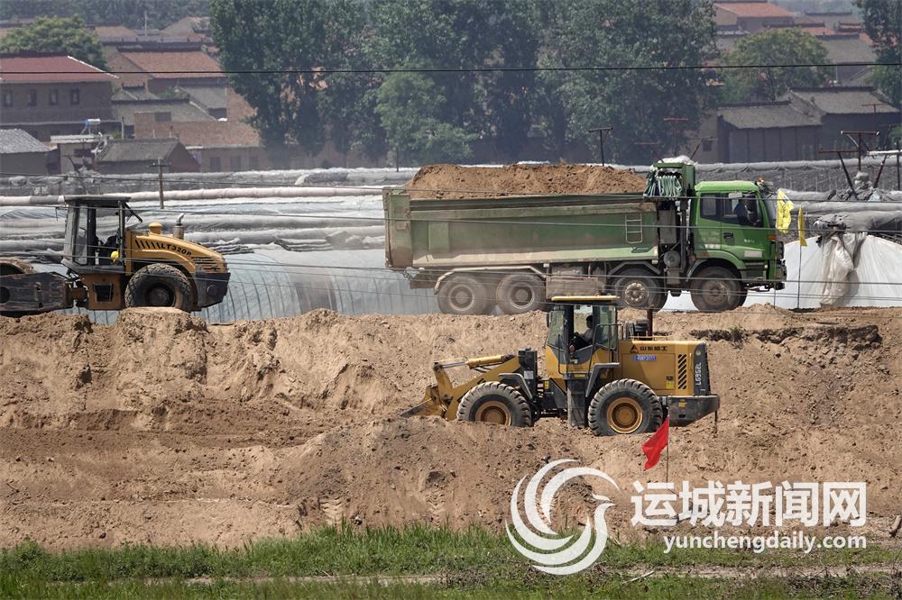 芒种时节,骄阳似火。汾河新绛段干流堤防治理达标工程现场,运土车川流不息,铲车不停挥动铁臂,压路机忙着压实路基,工作人员挥汗如雨紧张施工,到处可以感受到抢时间、赶进度、铸精品的浓厚氛围。