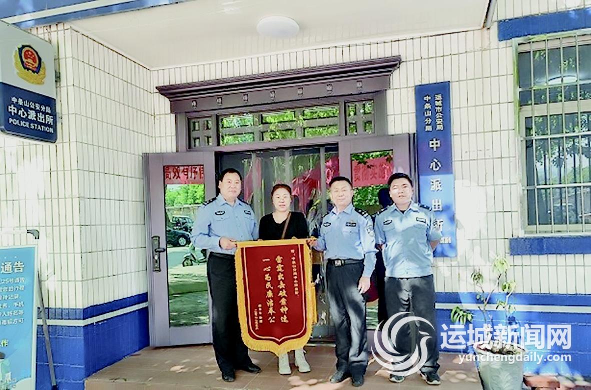 侯女士面对失而复得的钱包向民警连声道谢,并将一面印有“雷霆出击破案神速 一心为民廉洁奉公”锦旗送至中条山公安分局中心派出所(上图)。