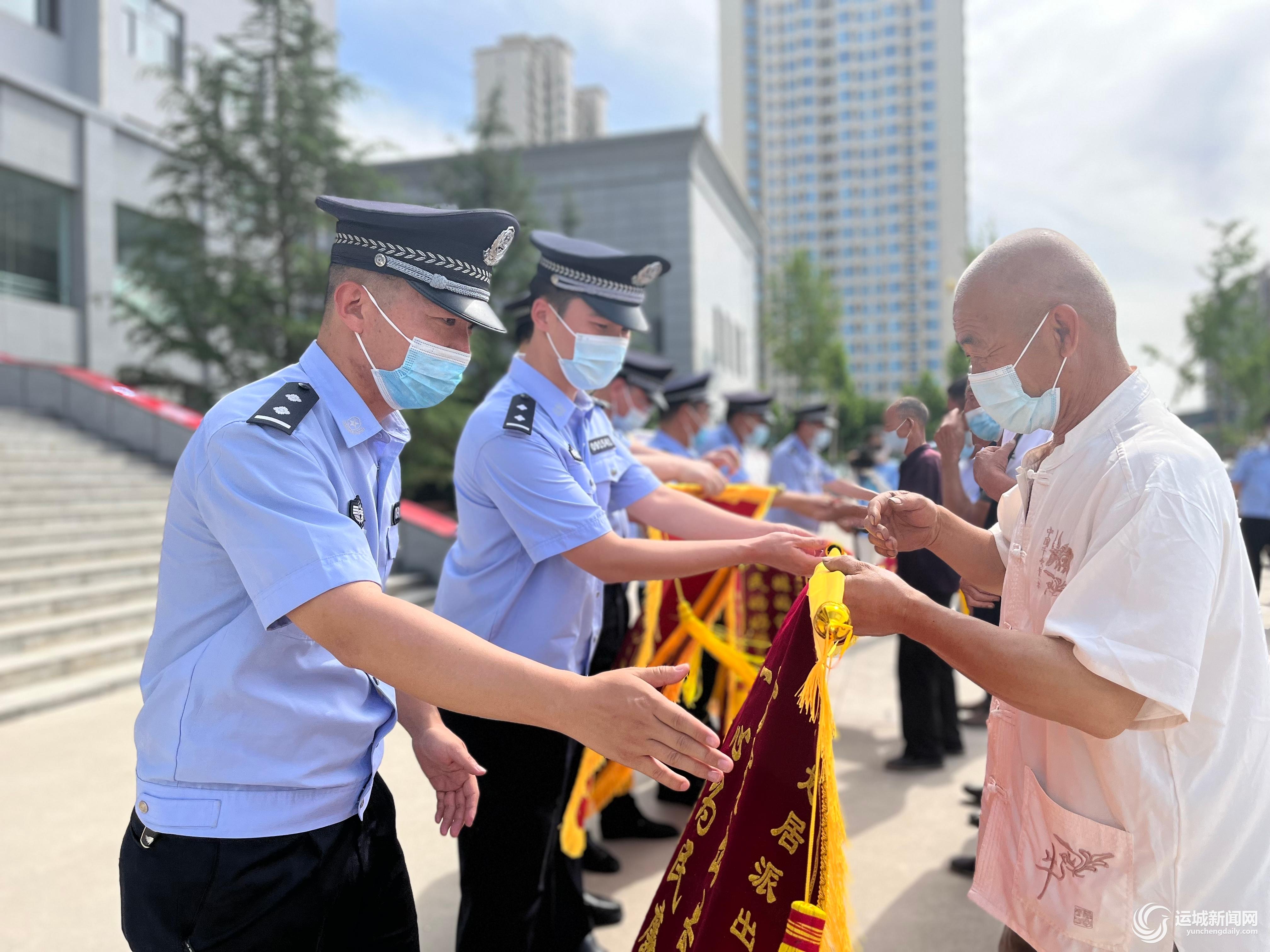 “真的非常感谢你们,本以为东西找不回来了,没想到这么快就把案子破了,这面锦旗你们一定要收下。”5月30日,在运城市公安局盐湖公安分局民生案件返还仪式上,家住盐湖区北相镇西曲马村的村民赵存根举着一面写有“热心为民 办案神速”的锦旗激动地对民警说道。当天的仪式上,盐湖公安分局集中返还了总价值100余万元的44辆电动车、5辆农用三轮车、24台电脑主机及烟酒、电视、现金等赃款赃物。66名受害群众欣喜地看着眼前的失而复得的财产,对民警忠诚履职、服务群众、全力维护人民群众生命财产安全表示认可和衷心感谢。