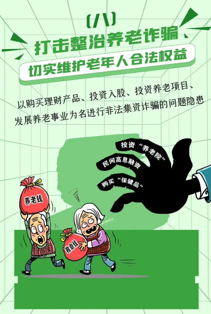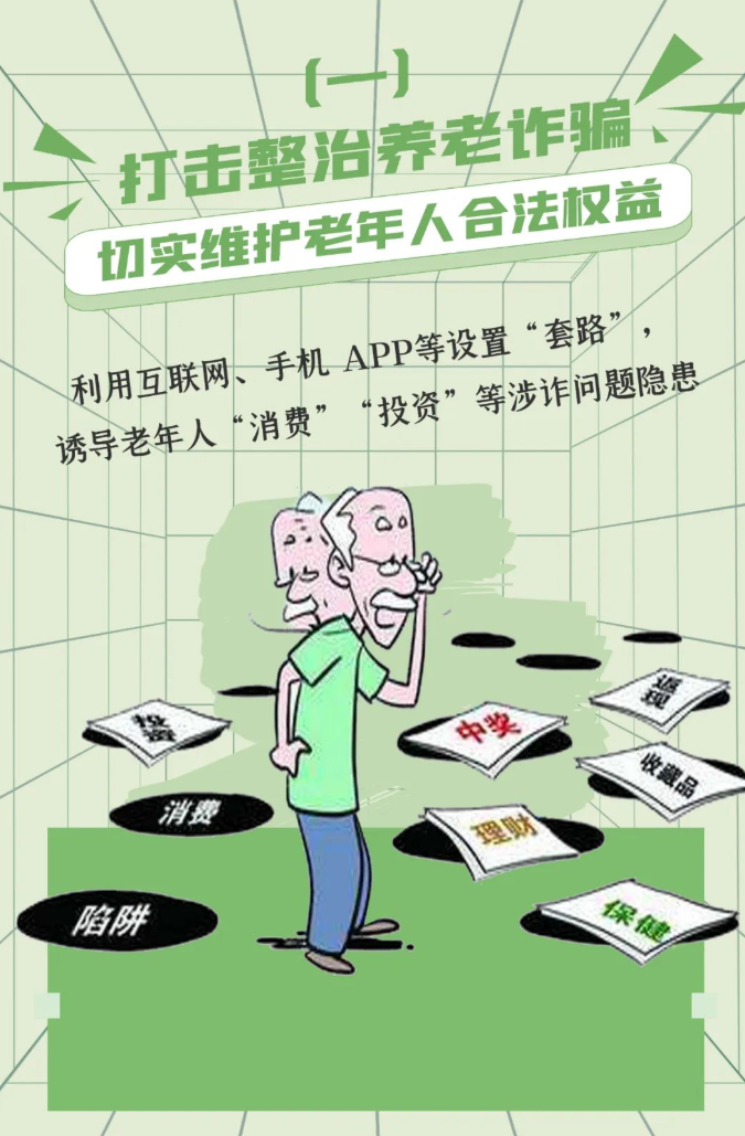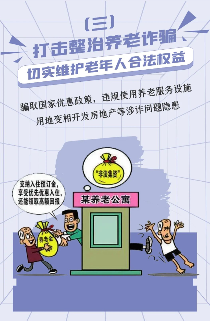警惕!以投资“养老项目”为名非法集资。一些机构或企业打着投资、加盟、入股养生养老基地,以销售虚构的养老公寓或者以长期出租养老床位、销售养老公寓使用权等名义,通过返本销售、售后返租、约定回购、承诺高额利息、“私募基金”等形式非法集资。