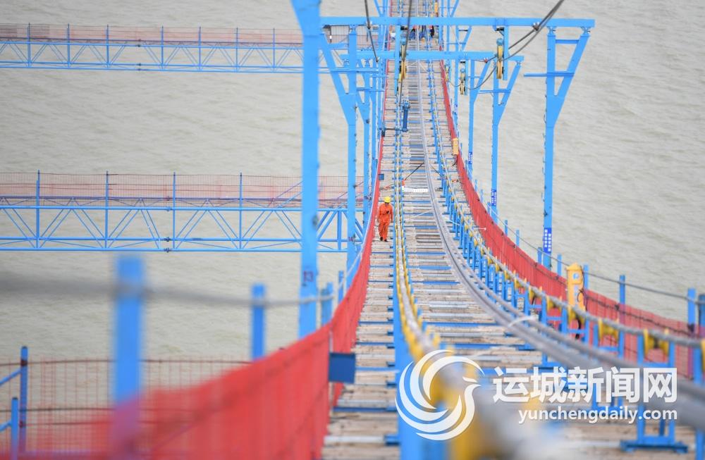 工人在深中通道伶仃洋大桥海上施工猫道上行走(6月7日摄)。 目前,深中通道各项建设正有序推进。其中,东、西两个人工岛稳步施工,伶仃洋大桥推进索股架设,中山大桥钢箱梁预计6月底合龙,沉管隧道已完成第26个管节的沉放安装。 深中通道预计2024年建成通车,采用东隧西桥方案,全长24公里,集“桥、岛、隧、地下互通”为一体,是粤港澳大湾区超级跨海集群工程,建成后将成为联系珠江口东西两岸的直联通道。新华社记者 邓华 摄